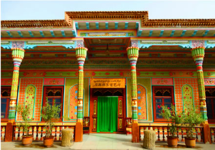 這座獨(dú)具刀郎人特色的大門,往上看可以看到是一個(gè)半圓,那是一個(gè)太陽圖騰,因?yàn)榈独扇嗽谛叛鲆了固m教之前曾信仰過薩滿教,薩滿教有圖騰崇拜的習(xí)俗,所以這也是信仰薩滿教遺留下來的一種圖騰崇拜。中間有動(dòng)物頭飾,在這里掛動(dòng)物頭飾一方面是起個(gè)裝飾作用,另一方面辟邪,同時(shí)這些動(dòng)物頭飾也反映了刀郎人過去的游牧生涯。走進(jìn)這個(gè)大門時(shí)也是有講究的,中間的這個(gè)正門它是部落酋長或者是部落里來了比較尊貴的客人走的,普通老百姓是從兩邊的側(cè)門走而且是男左女右這樣分開來走的。