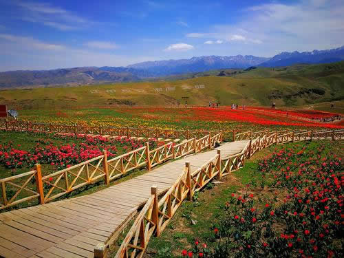 斷橋名字的由來(lái)有兩種說(shuō)法:一種說(shuō)法是,最初這里有一座橋,但總是會(huì)被水沖斷,故稱“斷橋”。另一種說(shuō)法是,為了方便哈薩克牧民轉(zhuǎn)場(chǎng)時(shí)趕著牛羊通過(guò),建在草地之上原本連續(xù)的木棧道,在此斷開(kāi)一個(gè)缺口,得名“斷橋”。由此可直接踏上木棧道,沿路觀景,向上可仰觀氣勢(shì)磅礴的雪山、挺拔的松林,向下可俯視爛漫山花與草地上的牛羊,天山麥海、空中草原、林海雪峰,每一處景觀都美不勝收。