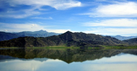 伊雷木湖位于額爾齊斯河與卡伊爾特河交匯處,湖面面積212.5平方千米,海拔1120米,蓄水1.13億立方米,水最深處約100米,從空中俯瞰呈巨大的"8"字形,是富蘊(yùn)大地震斷裂帶上最大的堰塞湖。湖東西兩側(cè)雄峰屹立,南北兩側(cè)綠樹(shù)環(huán)繞,良田萬(wàn)頃,村舍鑲嵌。湖面中央被東西兩座大山削去大半。