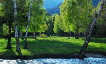 白樺林生長(zhǎng)在額爾齊斯河凸岸河灣上,面積1.5平方千米,由三個(gè)大小不一的白樺洲組成,以白樺樹(shù)為主,西伯利亞苦楊為次,森林為寒溫帶山地闊葉次生林。