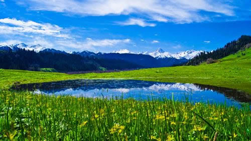 從闊谷東側(cè)穿林攀山而上,眼前一望無(wú)際,遼闊美麗的草原就是頗具勝名的庫(kù)爾德寧大草原。草原上山花爛漫,牛羊蠕動(dòng),群馬奔騰,處處都是“風(fēng)吹草地見(jiàn)牛羊”的動(dòng)人景象;山灣溪畔,密林排映之下是氈房點(diǎn)點(diǎn),炊煙裊裊;極目遠(yuǎn)眺,天際處,皚皚雪峰在陽(yáng)光照射下,幻化出五顏六色的光芒;齊齊的林線(xiàn)下是郁郁蔥蔥,綿延不絕的茫茫林海;藍(lán)天上,白云朵朵,雄鷹展翅翱翔;在草原西南側(cè),鑲嵌著一面園月以的小湖,水平如鏡,清澈見(jiàn)底,天光云彩,湖中徘徊,詩(shī)情畫(huà)意油然而生。日暮時(shí)分,夕陽(yáng)如血,霞飛滿(mǎn)天,光移景動(dòng),山色朦朧,群山露紅,層林盡染,更是難得的景致。庫(kù)爾德寧草原風(fēng)光無(wú)限,美麗如畫(huà),令人目不暇接。 |