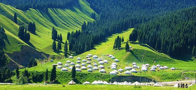 南山西白楊溝位于烏魯木齊南郊,距市區(qū)75千米,屬北天山的喀拉烏成山北麓,地處中山與低山過(guò)渡帶,海拔2252公尺,年降雨量500-600毫米。溝谷最里邊有一天然絕壁,其上,一條落差40余,寬約2米的飛瀑如白練飄舞,急瀉而下。草坡上有南山風(fēng)景管理處開(kāi)辦的氈房招待所,坡下有餐廳,可滿(mǎn)足游人食宿需要。
