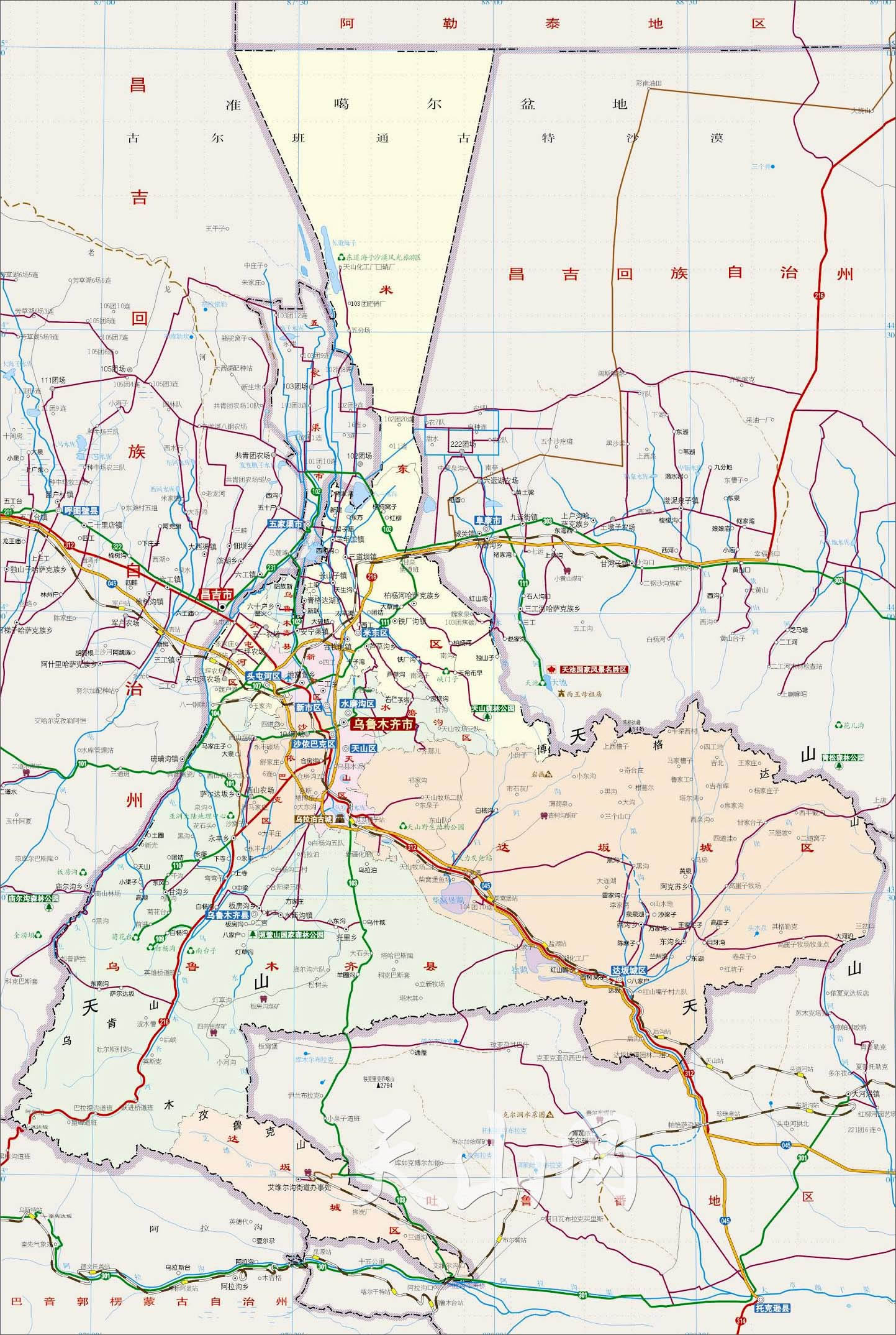 米東區(qū) 面積3407.42平方千米,人口279620,政府駐府前路,下轄8個(gè)街道、5個(gè)鎮(zhèn)、2個(gè)鄉(xiāng)
