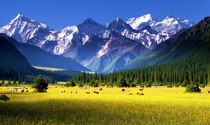 地形地貌 昭蘇縣為中亞內(nèi)陸腹地一個(gè)群山環(huán)抱的高位山間盆地,由于四周高山環(huán)抱,形成了一個(gè)較為獨(dú)特的自然生態(tài)環(huán)境,海拔在1323米-6995米之間。南部為天山主脈,山勢(shì)雄偉,高峻綿亙,是阻擋南疆沙漠干熱風(fēng)的天然屏障;北部為烏孫山,呈東西走向,山體較矮;西部受沙爾套山以及哈薩克斯坦境內(nèi)查旦爾山的阻隔,形成一個(gè)南、西、北三面高,東部略低的盆地。山地、丘陵與平原之比為4∶1。號(hào)稱“天山之父”的汗騰格里峰,位于西南部的中哈邊境線上,海拔6995米,是天山山脈第二大高峰,終年積雪區(qū)達(dá)100平方公里以上,是特克斯河的主要水源。是新疆境內(nèi)唯一一個(gè)沒(méi)有荒漠的縣。