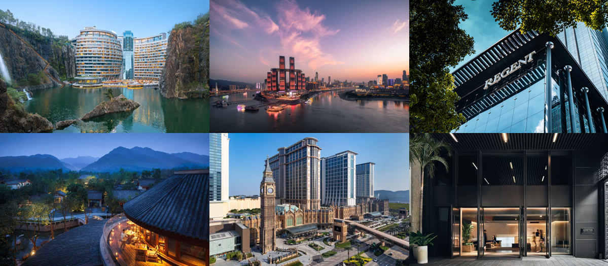 第二行從左至右:青城山六善酒店,洲際度假村聯(lián)盟澳門(mén)倫敦人酒店,臺(tái)北金普頓大安酒店