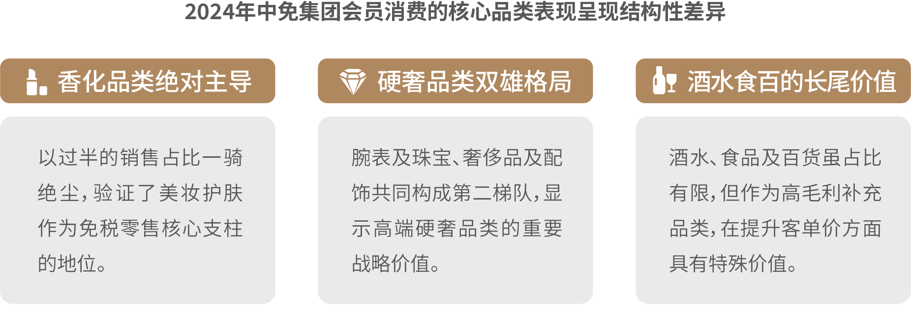 在核心品類消費(fèi)維度,彩妝香水增長亮眼,外籍旅客、男性客群、國潮品牌成為品類重要的增長點(diǎn);奢侈品及配飾方面,消費(fèi)結(jié)構(gòu)多元化,超高端市場增長顯著,輕奢區(qū)間保持穩(wěn)定需求;腕表及珠寶方面,品類分化顯著,首飾品類同比增長,腕表需求區(qū)域性特征突出;酒水方面,市場擴(kuò)容升級,品類及人群消費(fèi)分層顯著,渠道互補(bǔ)發(fā)展,呈現(xiàn)出規(guī)模擴(kuò)張與結(jié)構(gòu)升級并行的顯著特征;食品及百貨方面,市場穩(wěn)健擴(kuò)容,圈層特征鮮明,Z世代和銀發(fā)人群正在引發(fā)新的情感和健康消費(fèi)變革。
