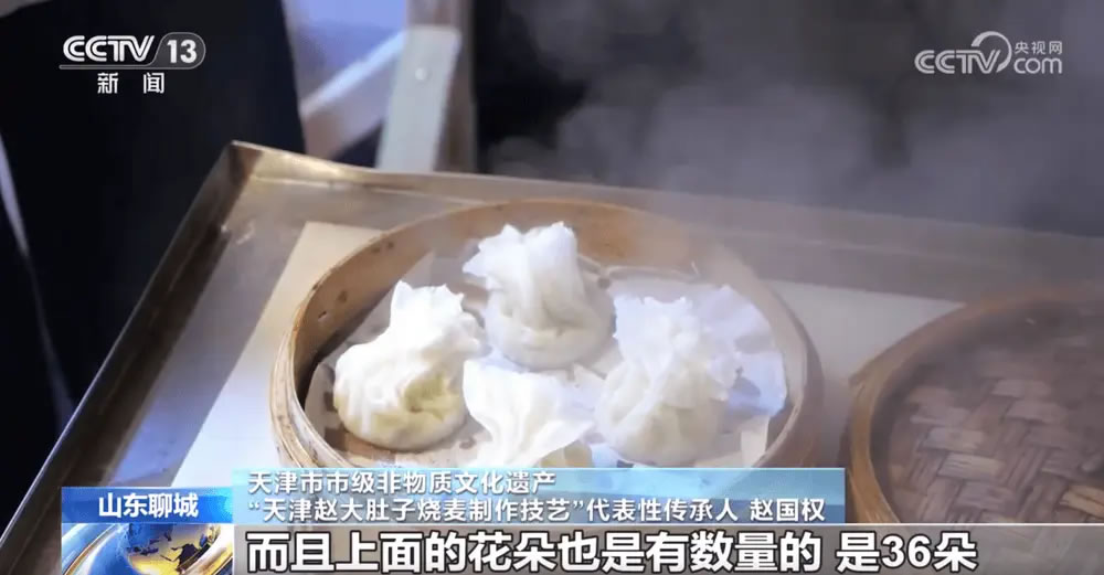 天津市市級非物質(zhì)文化遺產(chǎn)“天津趙大肚子燒麥制作技藝”代表性傳承人 趙國權:趙大肚子燒麥最大的特點是皮子特別薄,上面的花朵也是有數(shù)量的,是36朵。一邊24朵一邊12朵,代表著中國的24個節(jié)氣和一年的12個月份。