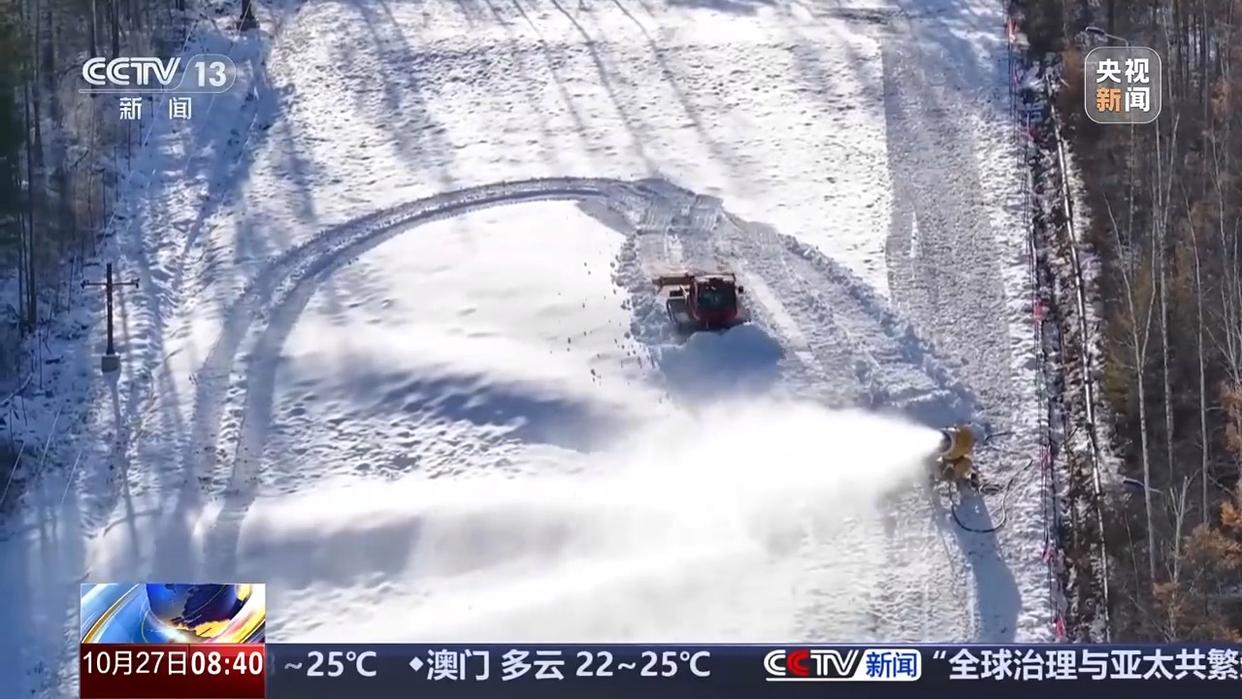 在漠河市北極村,滑雪場(chǎng)也已進(jìn)入開滑前的沖刺階段,造雪機(jī)、壓雪車24小時(shí)不間斷作業(yè),預(yù)計(jì)下周就能開板。