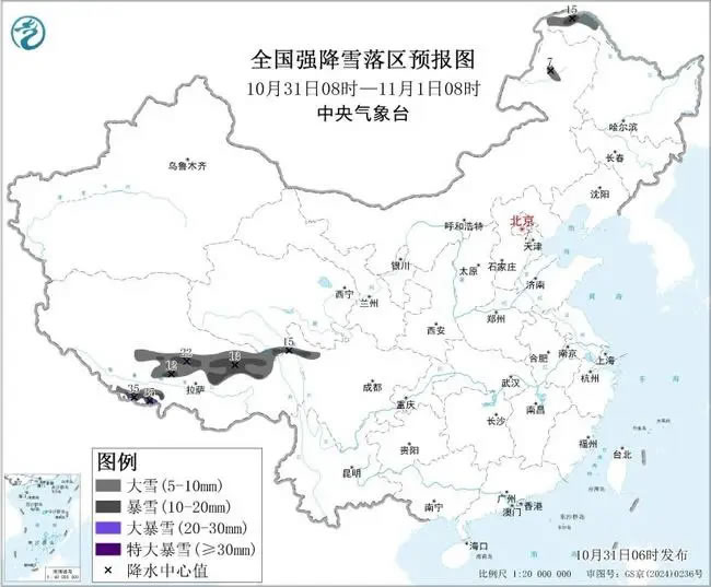中央氣象臺10月31日6時繼續(xù)發(fā)布暴雪藍色預警:預計10月31日8時至11月1日8時,西藏中東部和西南部、川西高原北部、黑龍江西北部、內蒙古東北部等地部分地區(qū)有大到暴雪,其中,西藏中部局地有大暴雪,西藏西南部局地有大暴雪或特大暴雪(30~35毫米)。上述部分地區(qū)新增積雪深度4~8厘米,山區(qū)局地可達15厘米以上。