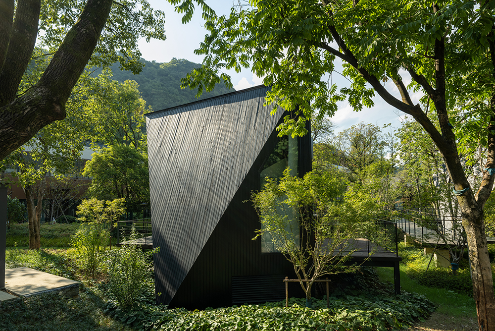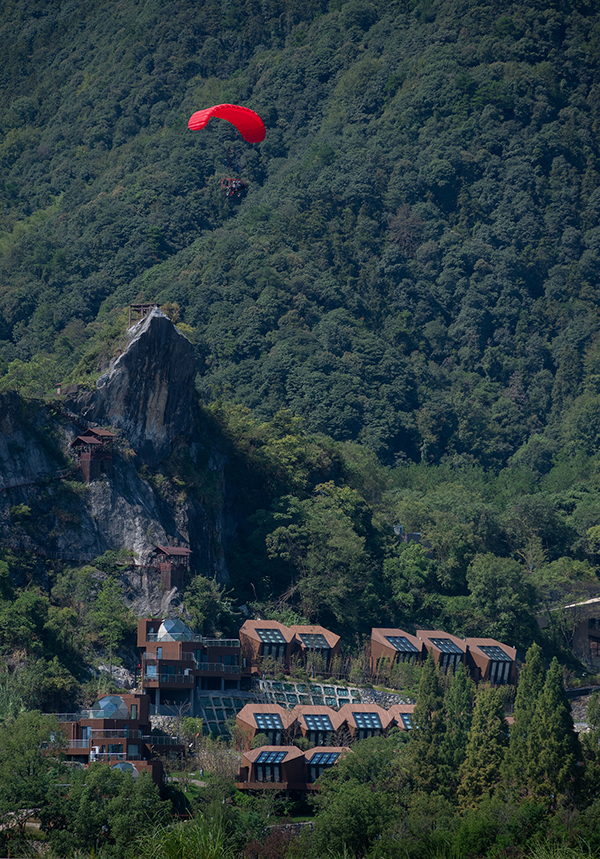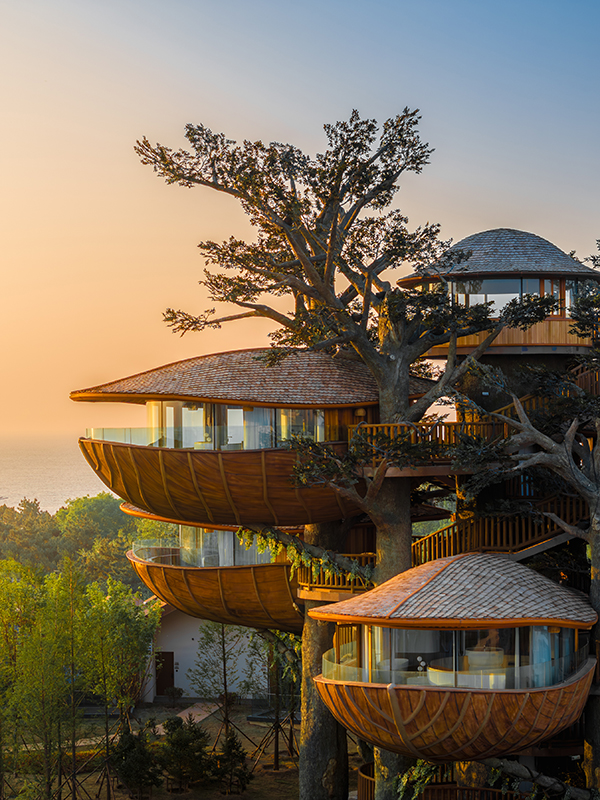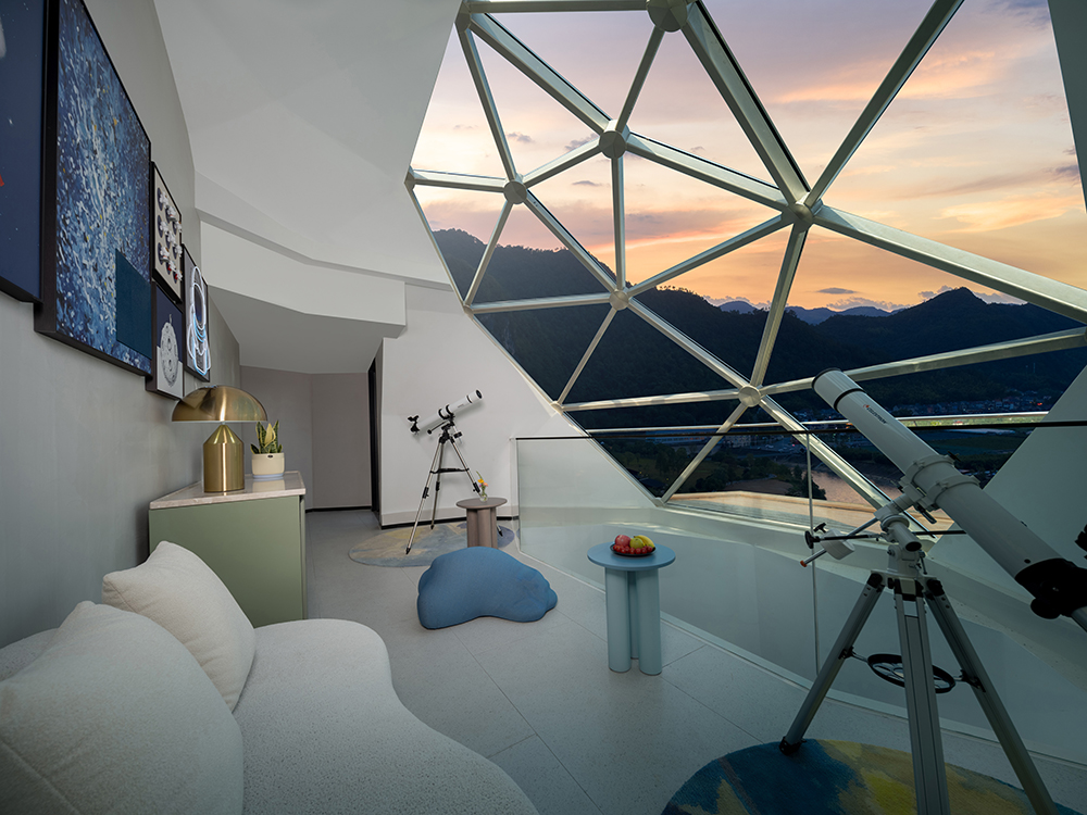 架空設(shè)計(jì)的海螺屋客房隱于林間,如同童話故事中的精靈居所,為住客營(yíng)造出私密而夢(mèng)幻的休憩空間;天文臺(tái)客房懸于巖壁之上,通過(guò)客廳的望遠(yuǎn)鏡和全景天窗可賞星河美景,將浩瀚星空引入室內(nèi);炭晶舍客房以傳統(tǒng)炭雕藝術(shù)為靈感,通體的炭黑色藝術(shù)感十足,展現(xiàn)出材料與自然的深度對(duì)話;復(fù)式結(jié)構(gòu)的玉江舍客房,則讓賓客在空間轉(zhuǎn)換中,收獲山川、江潮等不同的觀景視野,實(shí)現(xiàn)移步換景的居住意境。