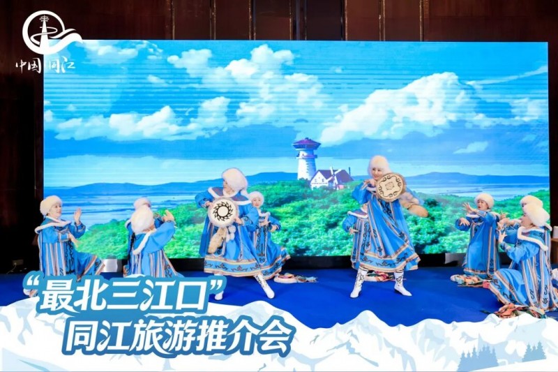 現(xiàn)場通過文創(chuàng)產(chǎn)品展示、宣傳片輪播、赫哲族舞蹈《赫尼那》迅速營造出同江冰雪與民俗氛圍。