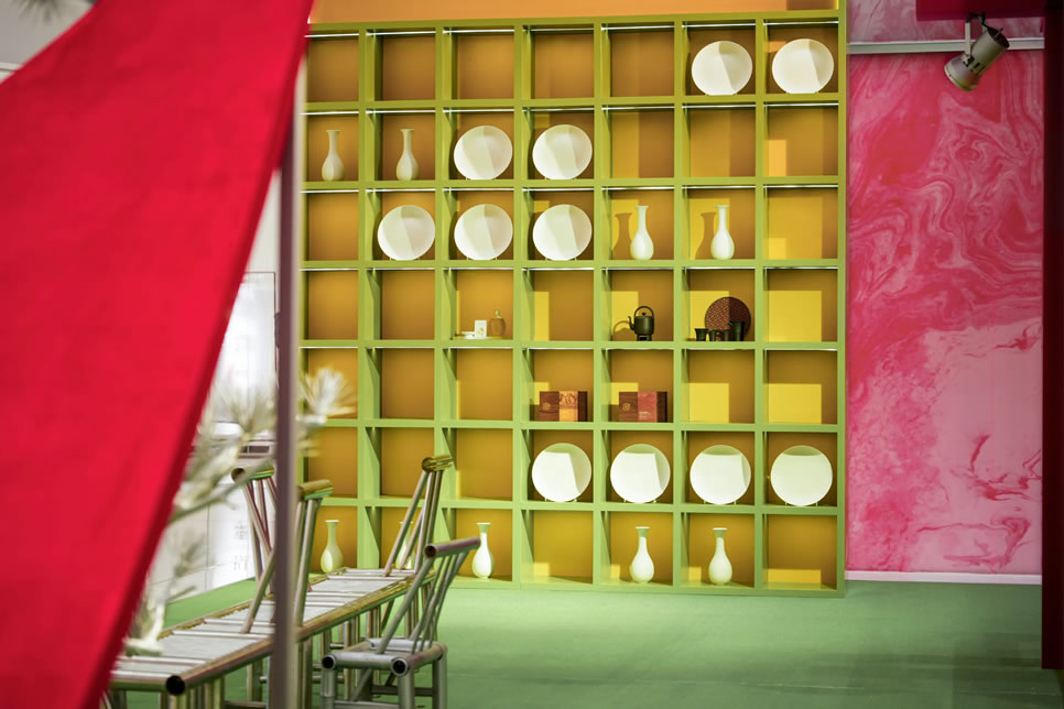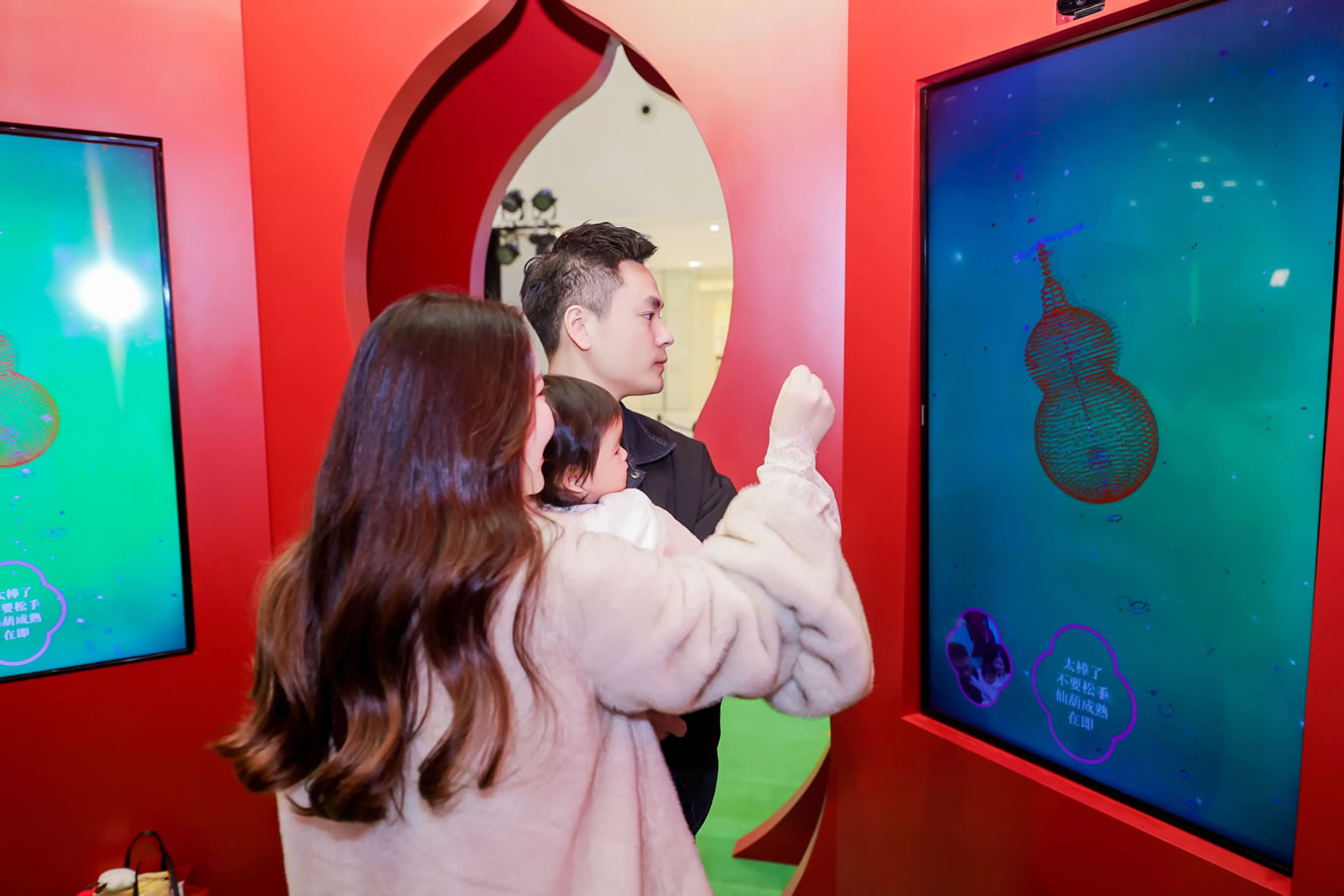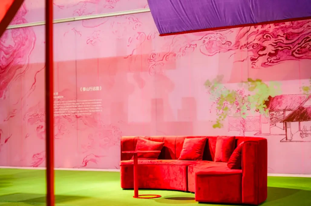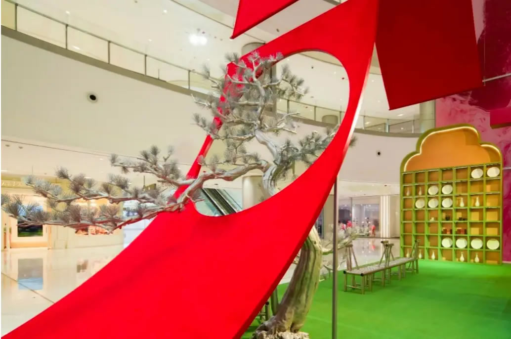 山水,并非遠(yuǎn)行才可得見(jiàn)。書(shū)法水墨藝術(shù)家劉玥首展作品《春山行遠(yuǎn)圖》以20米巨幅“山水開(kāi)卷”,步入其中,與天地春意從容照面;紅色的帷幔落于銀色的松枝上,就像于山間松下靜謐的一隅,“幕下棲心”將是絕佳開(kāi)年時(shí)尚大片的打卡處;松下銀椅,為你與摯友“漫敘往來(lái)”的相聚時(shí)刻營(yíng)造出寧?kù)o、松弛的氛圍;多寶閣中陳列著未經(jīng)雕琢的茶器素胚與場(chǎng)內(nèi)品牌萬(wàn)仟堂,長(zhǎng)沙尼依格羅酒店及tea'stone帶來(lái)的新春茶器,以“初芒蘊(yùn)能”詮釋著未來(lái)的無(wú)限可能與新生力量。轉(zhuǎn)身與“蒔光種愿” 四方亭相遇。葫蘆門朝四方而開(kāi),寓意著納四方福祿,步入其中,與數(shù)字交互藝術(shù)家吳旭首展作品《無(wú)限福祿》體驗(yàn)互動(dòng),跟隨指引揮動(dòng)手勢(shì),觸發(fā)粒子凝聚為動(dòng)態(tài)“福”字,親手完成一場(chǎng)新春祈福儀式。我們把象征團(tuán)圓與喜悅的紅色沙發(fā)打造“盞間聚暖”,如懷抱般圍合的布局作為“歸處”的隱喻。與家人團(tuán)聚便是心歸處,這將是中國(guó)年最圓滿的意象。