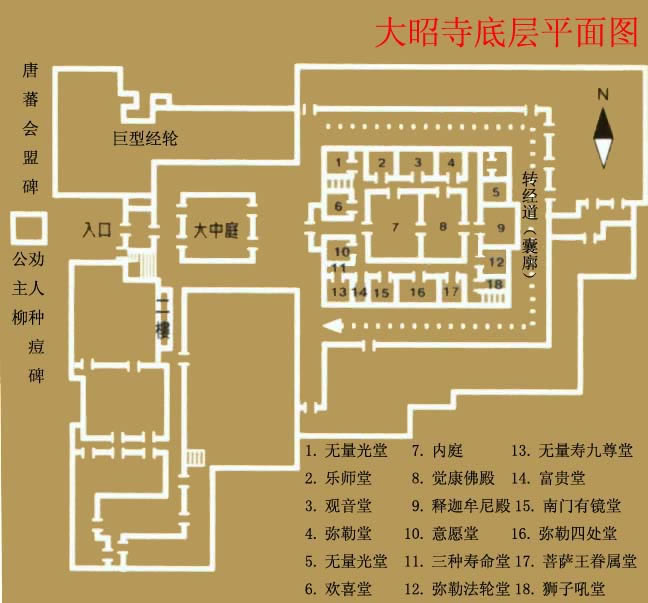從大昭寺金頂可以看到大昭寺廣場(chǎng),右邊遠(yuǎn)處山上是布達(dá)拉宮,近處的柳樹(shù)是“公主柳”,相傳是文成公主所栽。大昭寺的布局方位與漢地佛教的寺院不同,其主殿是坐東面西的。主殿高四層,兩側(cè)列有配殿,布局結(jié)構(gòu)上再現(xiàn)了佛教中曼陀羅壇城的宇宙理想模式。寺院內(nèi)的佛殿主要有釋迦牟尼殿、宗喀巴大師殿、松贊干布殿、班旦拉姆殿(格魯派的護(hù)法神)、神羊熱姆杰姆殿、藏王殿等等。寺內(nèi)擁有各種木雕、壁畫(huà)。