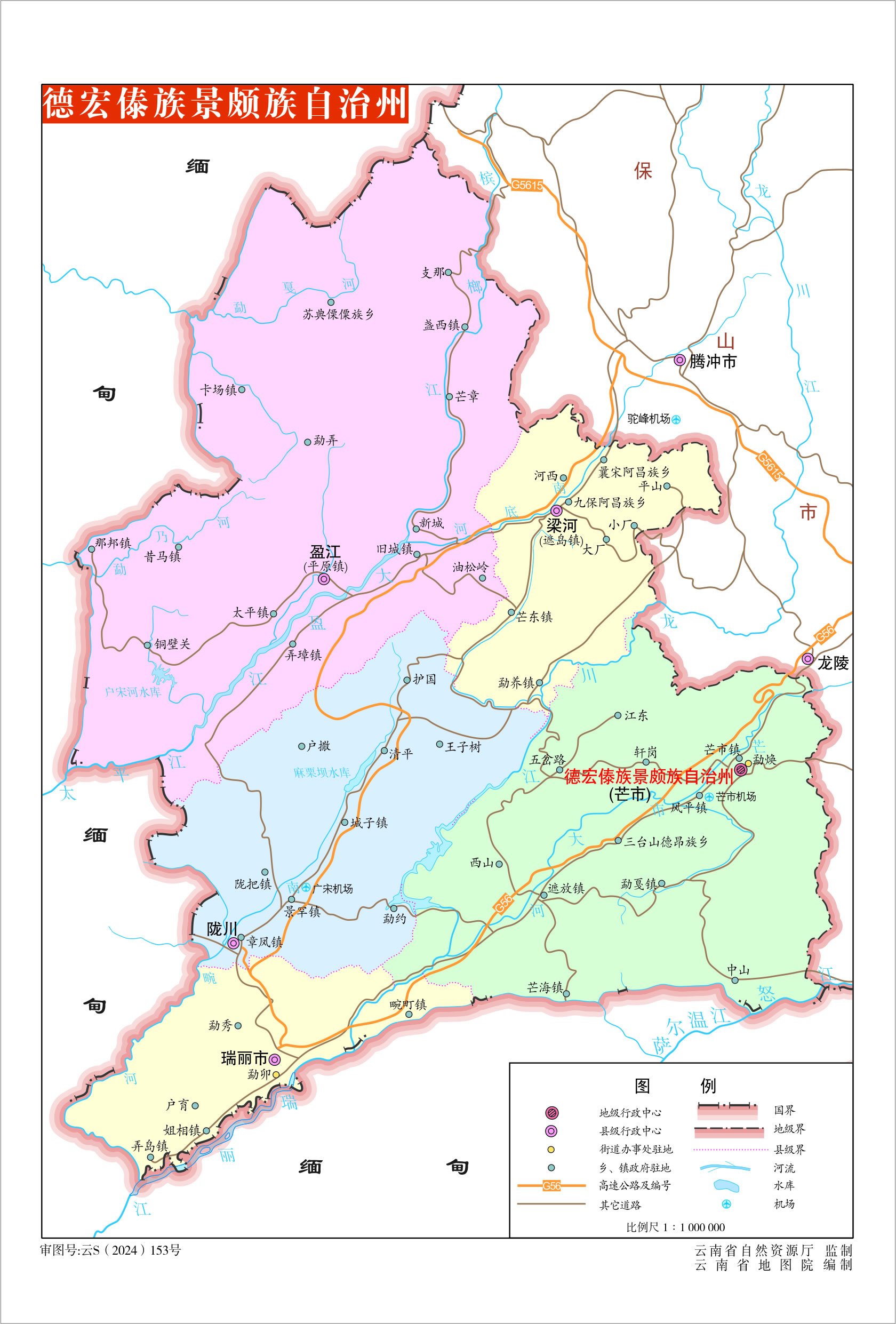 德宏傣族景頗族自治州轄2個縣級市、3個縣: