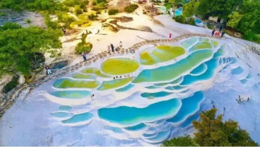 白水臺因碳酸鹽長年累月的沉淀,形成臺幔,好似層層梯田,故有“仙人遺田”的美稱,2022年11月9日,白水臺景區(qū)被確定為國家AAA級旅游景區(qū)。