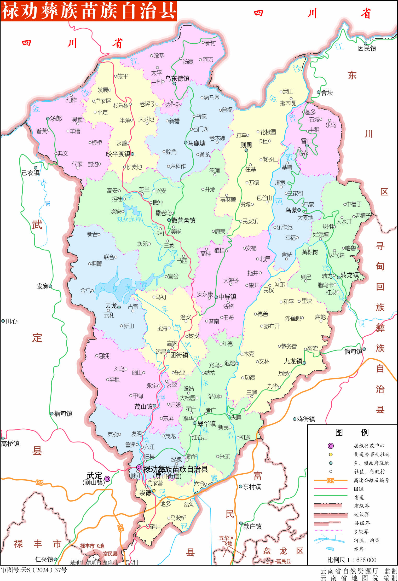 鎮(zhèn):撒營(yíng)盤鎮(zhèn)、轉(zhuǎn)龍鎮(zhèn)、茂山鎮(zhèn)、團(tuán)街鎮(zhèn)、中屏鎮(zhèn)、皎平渡鎮(zhèn)、烏東德鎮(zhèn)、翠華鎮(zhèn)、九龍鎮(zhèn)
