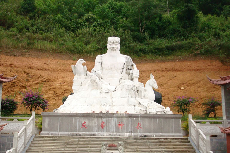 神農(nóng)祠:位于雙江自治縣勐庫(kù)鎮(zhèn)北部南勐河上游,勐庫(kù)大雪山萬(wàn)畝野生古茶樹(shù)群落山腳的古茶谷中心地帶。祠內(nèi)塑有一尊采用雪花白石雕制而成的炎帝神農(nóng)塑像,高9.5米,基座9米,寬4米。對(duì)稱建有兩間傳統(tǒng)民族風(fēng)格房屋,左為茶展館(以茶之源、茶之魂、茶之歌三個(gè)方面用54張圖片展示雙江勐庫(kù)大葉茶原生地形象和茶葉產(chǎn)業(yè)發(fā)展情況),右為茶藝館(在墻體上精心制作一幅反映雙江拉祜族、佤族、布朗族、傣族飲茶習(xí)俗為主的壁畫(huà),高2米,長(zhǎng)13.8米)。塑像基座四周及中心廣場(chǎng)共鋪貼大理青石板530.9平方米,從神農(nóng)祠牌坊至炎帝神農(nóng)塑像共有69級(jí)臺(tái)階。