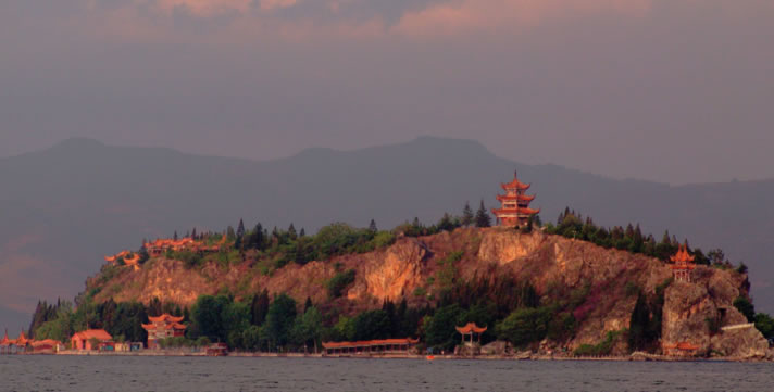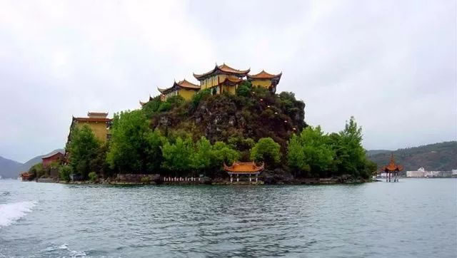 孤山,原名瀛海山,位于距江川城區(qū)約17公里的撫仙湖江川水域之中。明代以前瀛海山傍有一小島,兩島之間有一鐵橋相通。明末一夕地震,小島及虹飲橋沉沒,唯瀛海山屹然獨存,孤山由此得名。孤山成于宋,盛于明,曾建有八殿五閣三亭一堂一庵一塔。