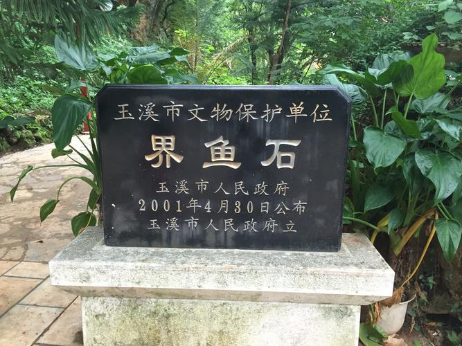 界魚石界魚石屬碳酸鹽巖石礫塊,石塊壁面上有經(jīng)地質(zhì)時期溶蝕形成的溶孔。界魚石背靠野牛山,面臨連通星云湖撫仙湖的玉帶河。石塊所在的北岸山坡林木茂密。玉帶河寬70m,水深3-4m,長約2.1km,在界魚石上題刻有“界魚石”,及清江川縣令李密題書“石怪鱗驚”,鐵嶺竺文人兆鵬題書“魚各有性”。