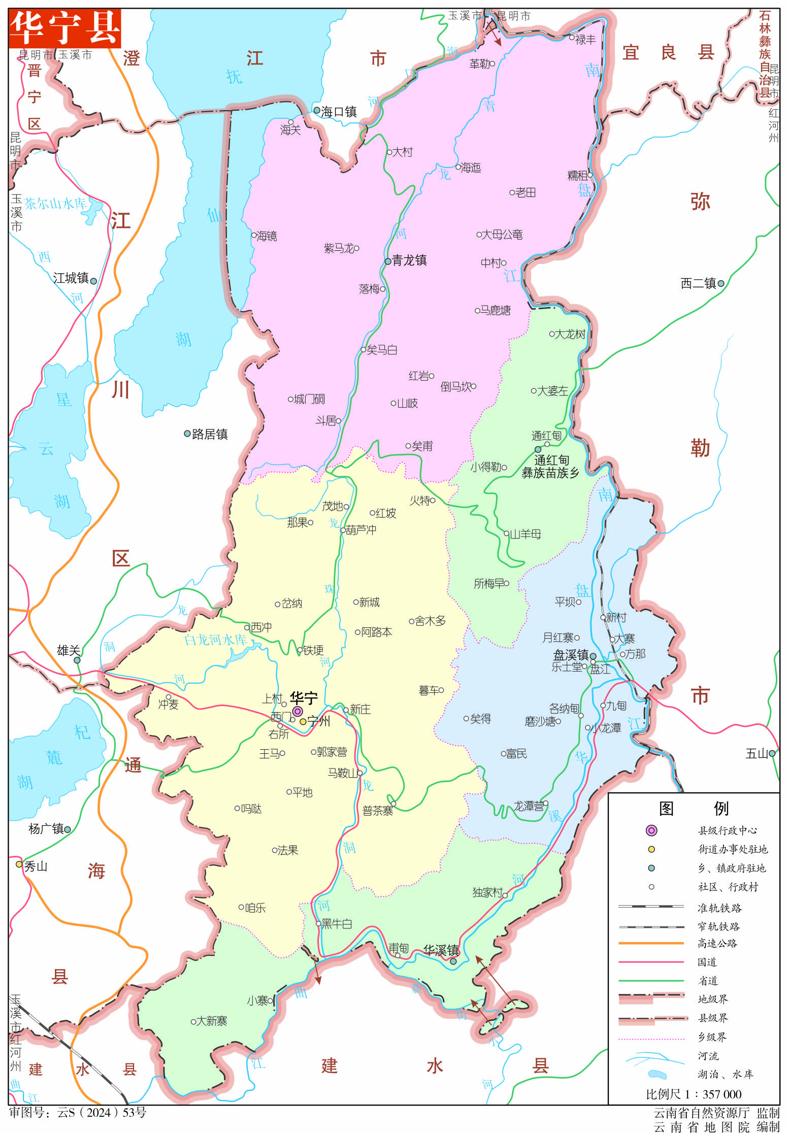 位置境域 華寧縣地處玉溪市東部,是撫仙湖、星云湖、杞麓湖“三湖”生態(tài)城市群的核心城市,也是昆河線經(jīng)濟(jì)帶上的重要節(jié)點(diǎn),距省會(huì)昆明148千米、玉溪市區(qū)53千米?偯娣e1313平方千米。