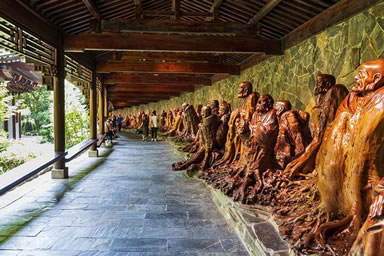 以根雕藝術(shù)展現(xiàn)佛教文化的圣地,是由千年樹神匯聚的藝術(shù)殿堂,建筑面積1.2萬平方米,縱深有三座大殿,第一幢為雙層結(jié)構(gòu),第二第三幢均為單層結(jié)構(gòu)。兩邊另有羅漢文化長廊依山而建,環(huán)繞其間,有未來佛殿、大雄寶殿、羅漢堂等,陳列有釋迦牟尼、未來佛、四大菩薩、四大天王、五百羅漢等佛教文化系列巨型根雕作品一千余件,其中最大的根雕釋迦牟尼主佛,形體龐大,重達(dá)40余噸,根材花巨資,于中緬邊境一路繞道跋涉而來,經(jīng)醉根“點(diǎn)化”,巍然成佛!五百羅漢陣更是氣勢雄偉,長達(dá)680余米,整體布局渾厚古雅,堪稱中華一絕、世界之最。