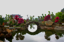 地處根宮佛國文化旅游區(qū)山麓,緊依根雕佛國,有醉松亭、日月亭、回思廊、靜心亭、樂禽園等景觀建筑,陳列有以松柏類為主的盆景藝術(shù)作品1500余盆,造型博采眾長,創(chuàng)意自然,有小橋流水田舍人家的水旱盆景,有濃縮華山天險(xiǎn)附石盆景,有的以石為盆回歸自然,有的三五成林意境高遠(yuǎn),大自然的千奇百怪,于方寸間一覽無余,具有空中花園美譽(yù)。