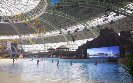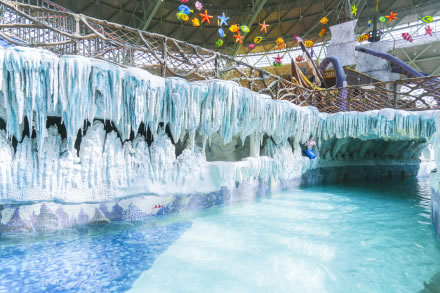 水之王國場館擁有室內(nèi)沙灘、超大型組合滑道(異域湍流)、冰谷漂流等項(xiàng)目設(shè)施。