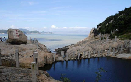 佛巖——大佛巖是桃花島的標志,它的奇特在于遠眺近望一樣大,在陽光反射下格外醒目,大佛巖底圍有268米,高72米,占地面積6239平方米,海拔287米,頂部面積百余平方米,攀登大佛巖是件很愜意的事,攀登雖不難,但也要攀藤扶樹,鉆洞擠縫恍然一種“山重水復疑無路,柳暗花明又一村”之感。清音洞——位于大佛巖中腹,洞口上刻有“清音洞”三字,為天然巖洞,洞中有一條石縫,寬約10厘米,長20余米,直通巖頂,有陽光射入石縫,是名符其實的“一線天”,此洞直通巖底,兩端說話傳聲清晰可辨,故稱“清音洞”。金庸先生在《射雕英雄傳》書中對此景點作了重要描述,成為黃藥師藏《九陰真經》和關押老頑童的石窟。