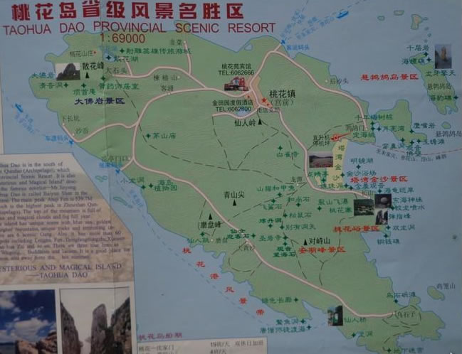 桃花島與——普陀山、“沙雕故鄉(xiāng)”——朱家尖、“十里漁港” ——沈家門組成普陀旅游金三角。 桃花島歷史悠久,宋乾道《四明國志》有證:客浦遺址考證,在商國時期就有人類活動的足跡。先秦,隱士安期生漂流至桃花島,采藥修道,開爐煉丹。嘗以醉墨灑于山石,遂呈桃花紋,奇形異狀,宛若天然,故石稱桃花石,山稱桃花山,島稱桃花島,被譽為“海上仙山”。桃花島擁有舟山千島第一高峰——安期峰,海拔539.7米;舟山第一深港——桃花港;東南沿海第一大石——大佛巖,巖體高 78米;舟山第二大沙灘——千步金沙;還是中國三大水仙名品之一的普陀水仙和浙江名茶之一的普陀佛茶的主要產地;又是浙江沿海島嶼中林木品種最多的島嶼,共有78科、556種,素有“海島植物園”之美譽。桃花島碧海金沙環(huán)繞、多奇峰怪石、林木蔥郁、氣候宜人、環(huán)境清幽、風光旖旎,集山、海、沙、石、礁、巖、洞、花、林、鳥、寺、廟、庵、天象奇觀、軍事遺跡、歷史紀念地、摩崖石刻、神話傳說于一體,自然景觀與人文景觀相映成輝,相得益彰。大佛巖是桃花島的標志,不但自然景觀獨特,而且蘊含著豐富的武俠文化內涵,是金庸筆下《射》書中桃花島主黃藥師的主要活動場所。大佛巖中腹的“清音洞”是先秦安期生漂流到桃花島后的第一個居室,在《射》書中是黃藥師藏《九陰真經》和關押老頑童周伯通的石窟。安期峰以峰、石為特色,寺、洞為主體,龍、道、佛三大文化為背景,具有山清、水曲、石趣、峰奇、境幽、氣爽的特點。安期峰是舟山群島獨一無二的風景,古代詩人在此留下了不少名句。安期生選此仙境長時期在此隱居,學道煉丹,直至白發(fā)蒼蒼,人稱“千歲翁”,為后人留下了寶貴的文化遺產。位于桃花島東海岸的桃花峪,奇巖壁立,桃花峪龍珠灘上,有一顆直徑80厘米,重約500公斤的球形石被人們稱為“東海神珠”。每當臺風將臨時,海浪激飛散落,形成七彩長虹似龍騰躍,龍珠在龍喉里吞吐翻滾,發(fā)出隆隆回音,編織出一幅美妙神奇的“金龍吐珠”圖,被譽為“中華一絕”。形如拇指從掌中彈出,孤峰矗立、刀削斧劈、懸崖絕壁的彈指峰,是桃花龍女恩賜給桃花島鎮(zhèn)海擋風的玉如意,也是金庸筆下桃花島主黃藥師練功習武之所。這里的海崖風光可謂佳境。難怪600多年前元朝文學家吳萊到此游玩時寫詩贊曰:“……雕鎪鬼斧觖,刮濯龍湫移……”清代文學家朱緒來桃花島泛舟環(huán)游,寫下了《桃花山》和《桃花龍?zhí)丁吩姡澝捞一◢u風光。在《桃花山》詩中還特別點出了觀環(huán)島景觀的感受,詩曰:“墨痕乘醉灑桃花,石上斑紋爛若霞。浪說武陵春色好,不曾來此泛仙槎!碧一◢u不但具有濃郁的漁鄉(xiāng)風情和民俗文化,而且各代不少文人墨客、旅行家來桃花島觀光、探奇、尋古、考證,從先秦的安期生第一個上島之后,漢時的大臣李少純;宋時的文學家蘇軾;元朝文學家詩人吳萊;明朝的文學家、軍事家朱丸;清朝文學家、詩人朱緒、繆燧;直到當代武俠文學大師金庸,每一位名人都留下了與實景相結合的作品。
