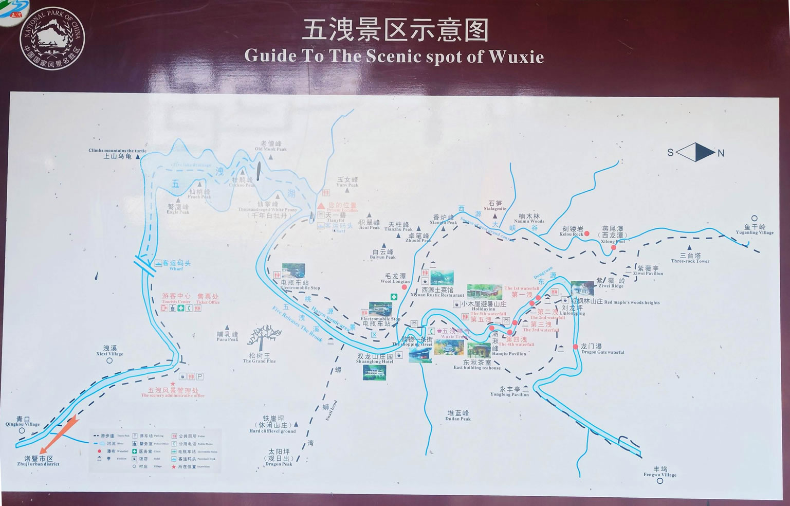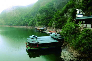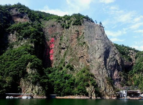 由紫藤長(zhǎng)廊拾階登上壩頂,眼前展現(xiàn)的是一湖靜水,綠水蕩漾,深不可測(cè)。 水面上疾駛的游船,不時(shí)激起層層漣漪,把兩岸的元寶峰,鷲鷹峰,仙桃峰、杜鵑峰、老僧峰、仙掌峰等山峰的倒影彎折。 泛舟湖上,水鳥在水面低飛,狹長(zhǎng)的湖面見不到盡頭,大有“青山綠水景無盡”之感,又有“一折青山一扇屏,一彎綠水一古琴”的詩意。沿湖兩邊,蔥蘢俊秀,美不勝收。春天萬木崢嶸,紅杜鵑從綠樹叢中透出;夏天滿山蔥郁,濃蔭蔽日;一到秋冬季節(jié),蒼黃的銀杏葉和紅艷的楓葉,點(diǎn)綴在一片蕭瑟之中。