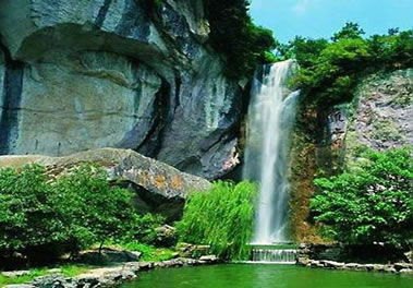 雙龍出海第二洩:二洩緊接一洩,落差為7.1米。瀑布下落時(shí),被一塊兀石分成兩半,分流如珠簾飄動(dòng),開朗而又深沉,又如雙龍出游不知天高地厚,古人有詩贊其曰:兩龍爭(zhēng)壑不知應(yīng),一石橫空不渡人。