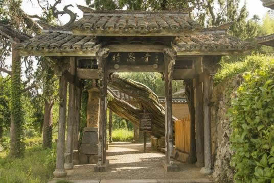 進了山門,邁上幾級臺階,有一個黃土砂礫鋪筑的小天地,右側(cè)有石臺階,通向枝桿蒼虬的柳杉王;左側(cè)是下坡道,通向時思寺的鐘樓與大殿;迎面是一堵砂石黃泥壘筑的儀門,通向梅氏宗祠。